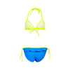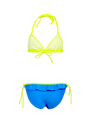 Лиф-подвижные треугольники в изящных оборочках фиксируются на шее и спинке длинными завязками.