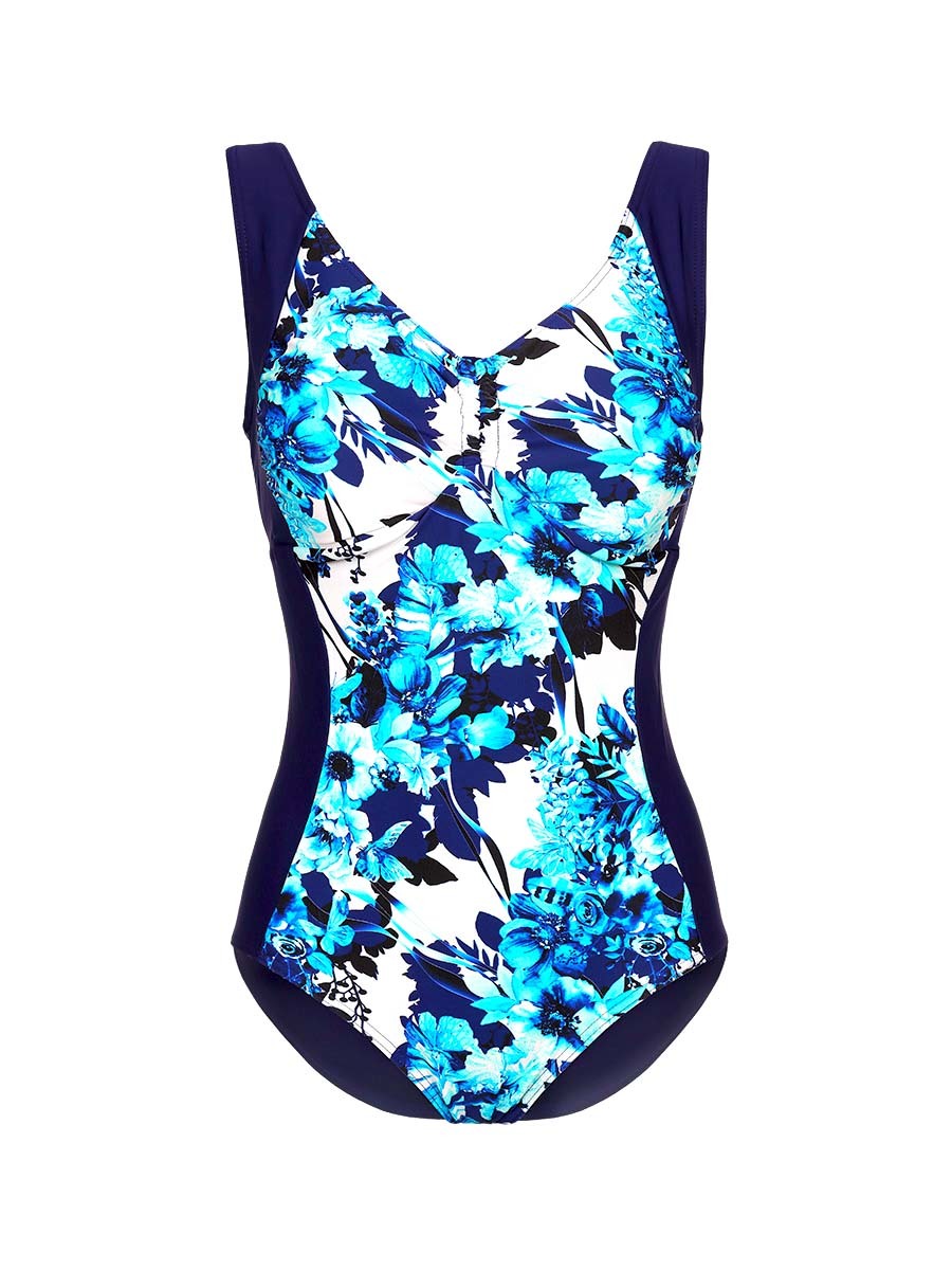 Ч 22.8.10 Купальник женский цельнокроенный с мягкими чашками. Перед купальника с яркой принтованной вставкой и присборенным лифом по центру на шнурочке.