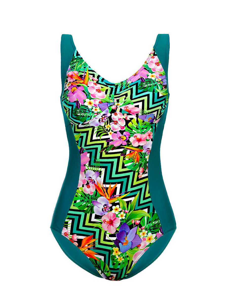 Ч 22.8.3 Купальник женский цельнокроенный с мягкими чашками. Перед купальника с яркой принтованной вставкой и присборенным лифом по центру на шнурочке.