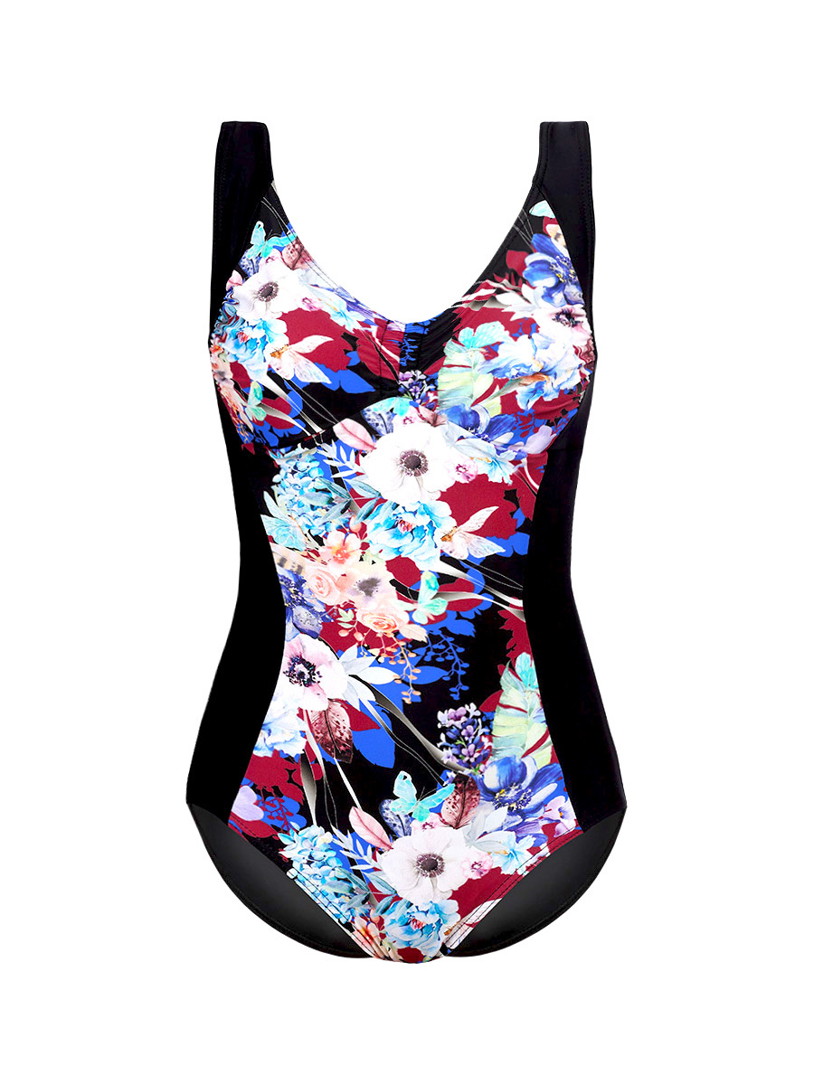 Ч  22.8.94  Купальник женский цельнокроенный с мягкими чашками. Перед купальника с яркой  принтованной вставкой и присборенным лифом по центру на шнурочке.