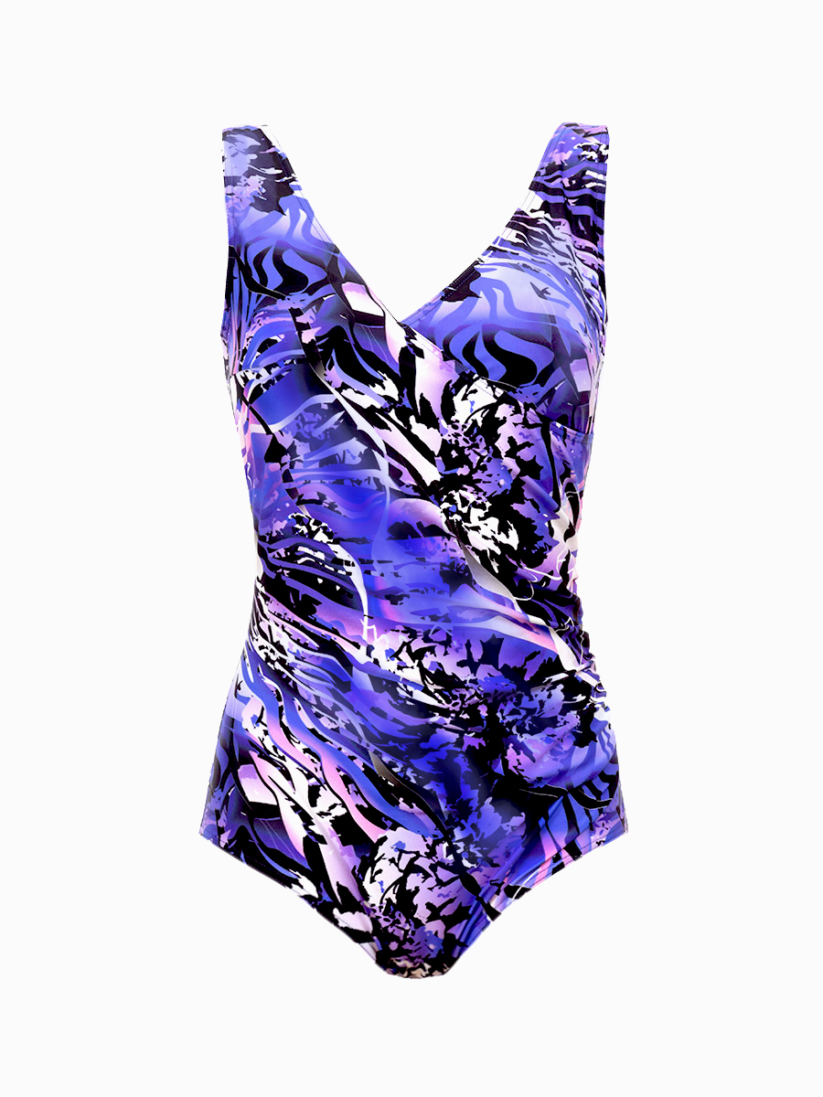 Ч 22.9.8 Купальник женский цельнокроенный больших размеров, с чашечками, с запахом переда и легкой драпировкой от бокового шва. Выполнен из ткани с очень интересным принтом. Спинка с вырезом средней глубины.