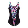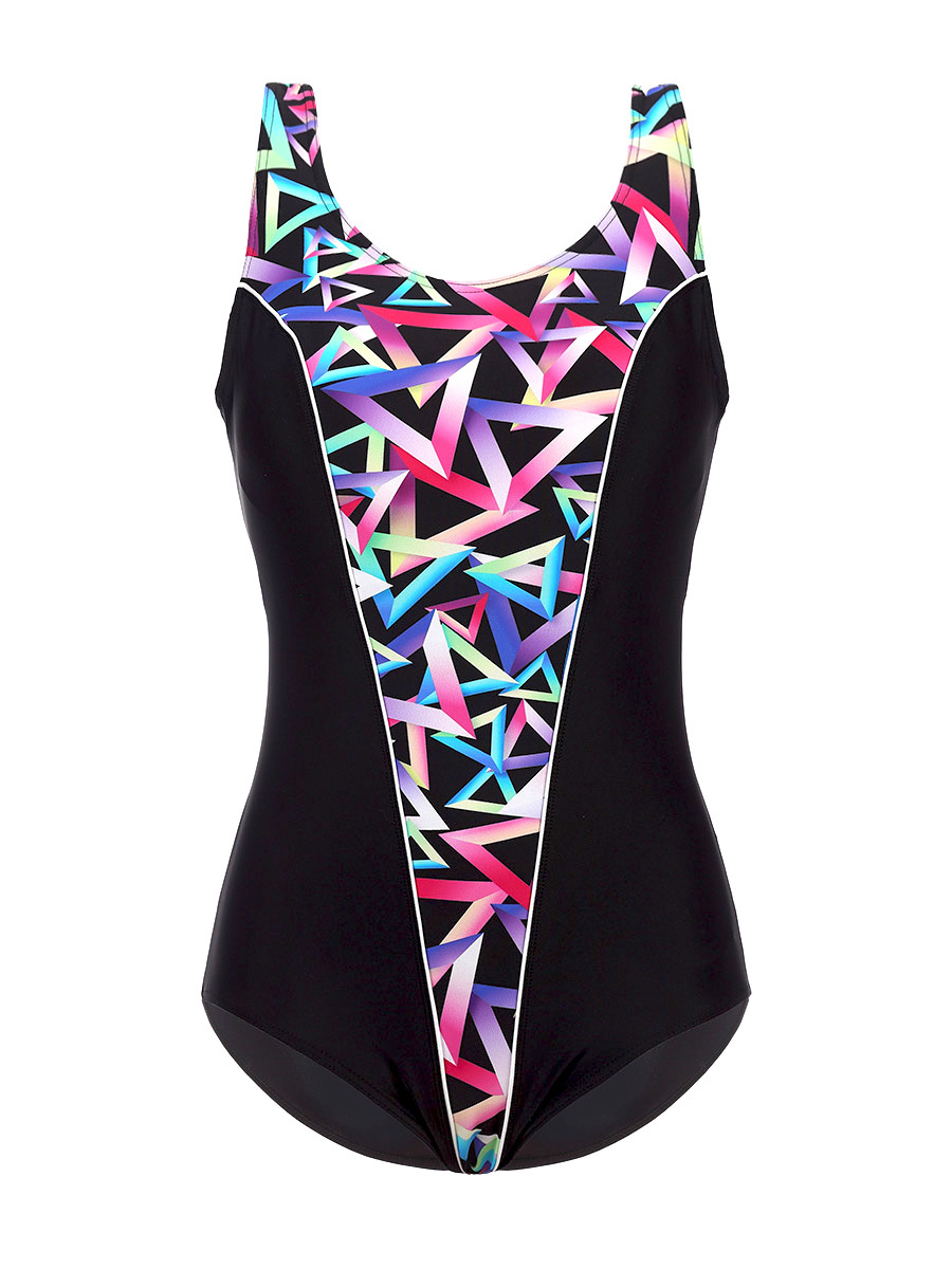 Купальник женский цельнокроенный с мягкими чашечками, с пестрым рисунком на передней вставки, швы которой оформлены контрастным кантом, глубокий вырез на спинке. Выполнена из высокоэластичной ткани.