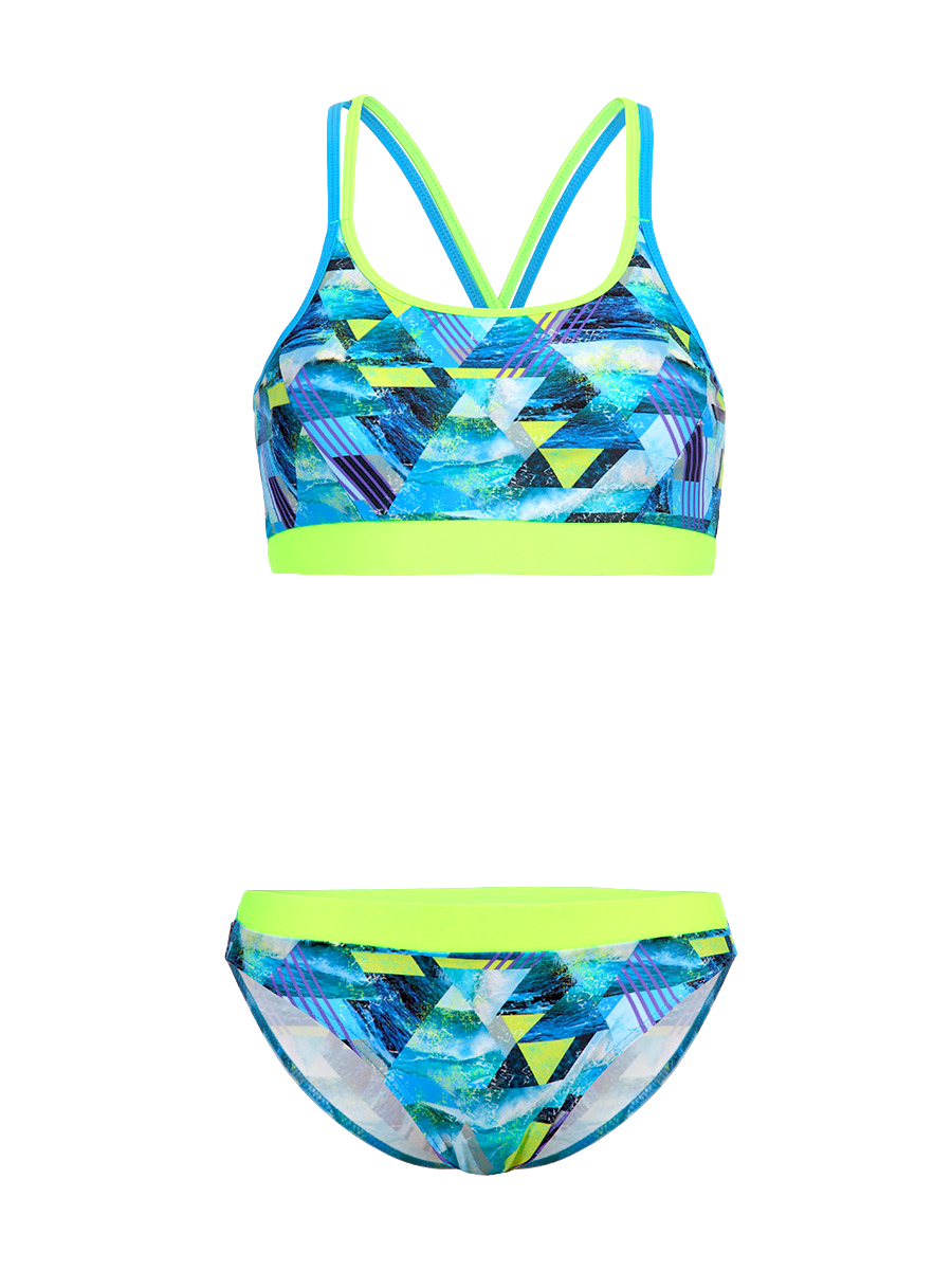 Ч 23.25 Двухпредметный купальник в спортивном стиле для плаванья выполнен в ярком модном принте. Верх- топ анатомического кроя с двойными тонкими лямками, сходящимися в центре спинки и с мягкими несъемными чашечками.