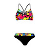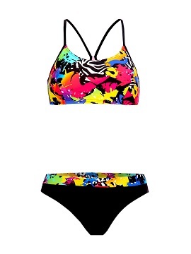 Ч 23.29 Двухпредметный купальник в спортивном стиле для плаванья выполнен в сочетании с ярком модном принтом и однотонной ткани. Верх- топ анатомического кроя с тонкими эластичными лямками, сходящимися в центре спинки и с мягкими несъемными чашечками.