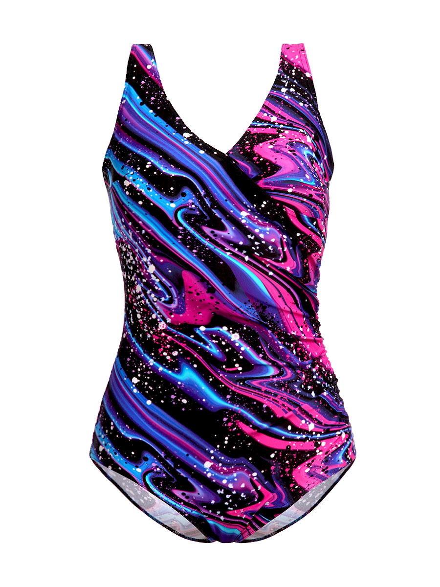 Ч 23.9.80 Купальник женский цельнокроенный больших размеров, с чашечками, с запахом переда и легкой драпировкой от бокового шва. Выполнен из ткани с очень интересным принтом. Спинка с вырезом средней глубины.