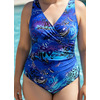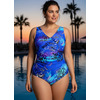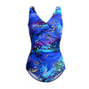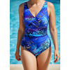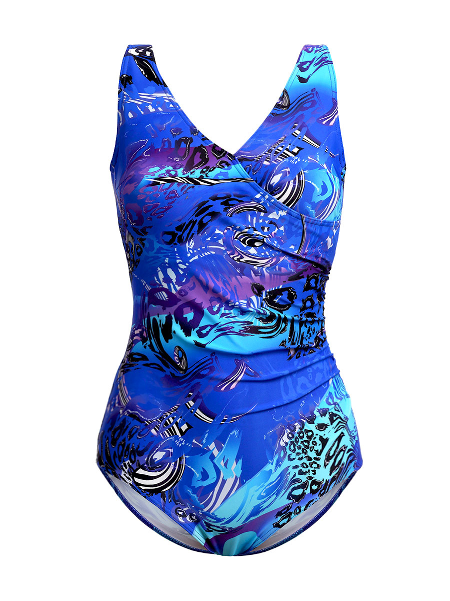 Ч 23.9.81 Купальник женский цельнокроенный больших размеров, с чашечками, с запахом переда и легкой драпировкой от бокового шва. Выполнен из ткани с очень интересным принтом. Спинка с вырезом средней глубины.