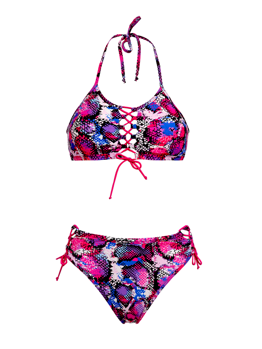 Ч 25.17 Купальник раздельный для девочек-подростков состоит из топа и плавок ,выполненных в ультромодном принте. Центр топа и боковые части плавок с эффектной шнуровкой, которая позволяет регулировать размер изделия. Топ с завязками на шее, с широкой эластичной резинкой под грудью, со съёмными чашками-вкладышами анатомической формы. Плавки с высокой посадкой , с широкой эластичной резинкой по верхнему срезу. Купальник на подкладке.