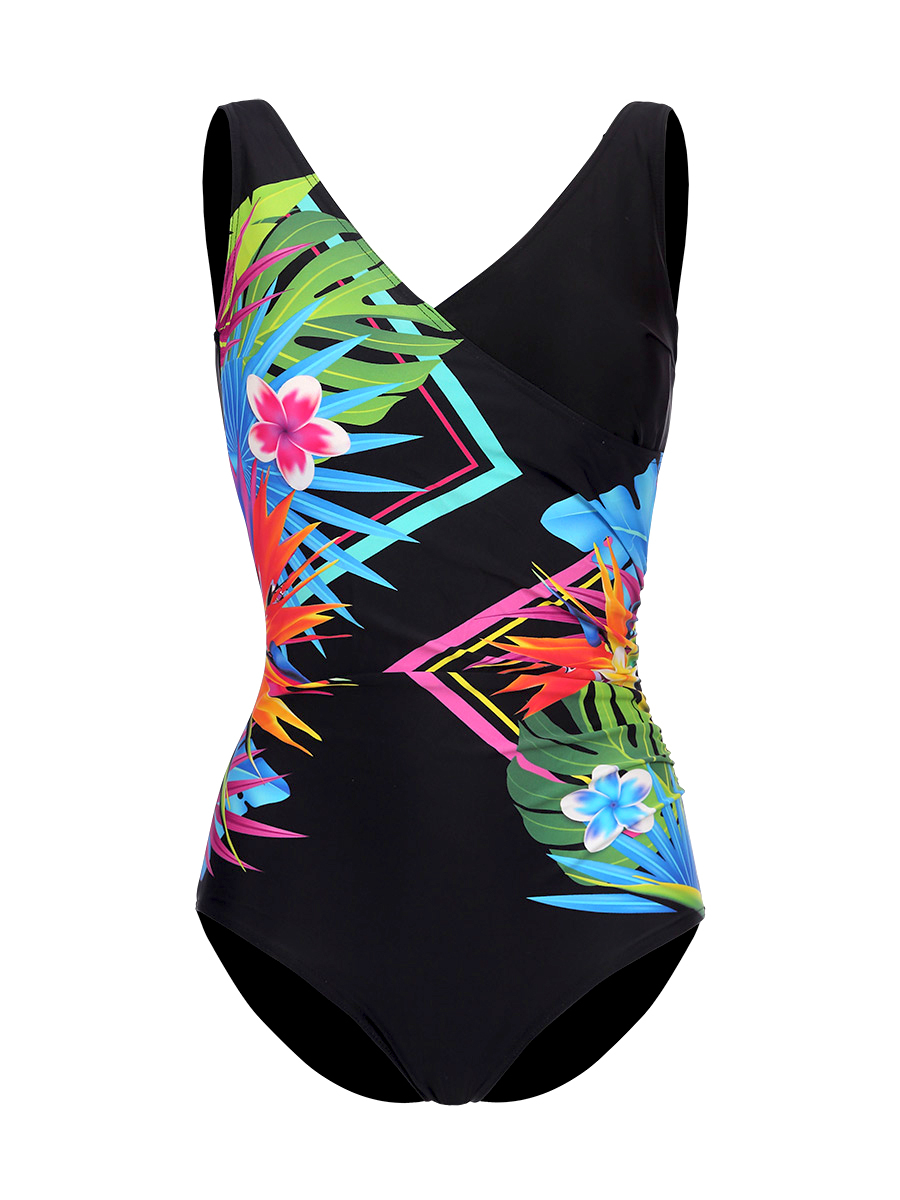 Ч 25.2 Купальник женский цельнокроенный больших размеров, с запахом переда и легкой драпировкой от бокового шва. Купальник с анатомическими мягкими несъёмными чашками , резинкой с силиконовым нанесением под линией груди, что дополнительно поддерживает грудь и добавляет плотное прилегание в данной области. Спинка с фигурным вырезом средней глубины. Печать основной ткани производится купонным методом, что гарантирует утвержденное распределение рисунка на модели. По горловине, проймам и ножкам вставлена эластичная резинка, обеспечивая комфортную посадку в эксплуатации.