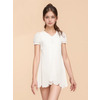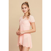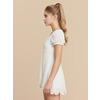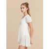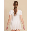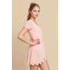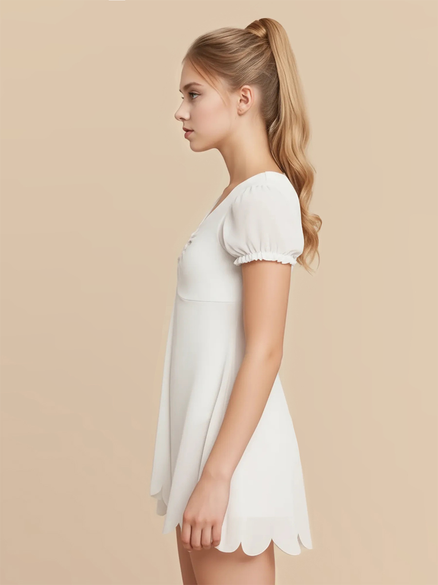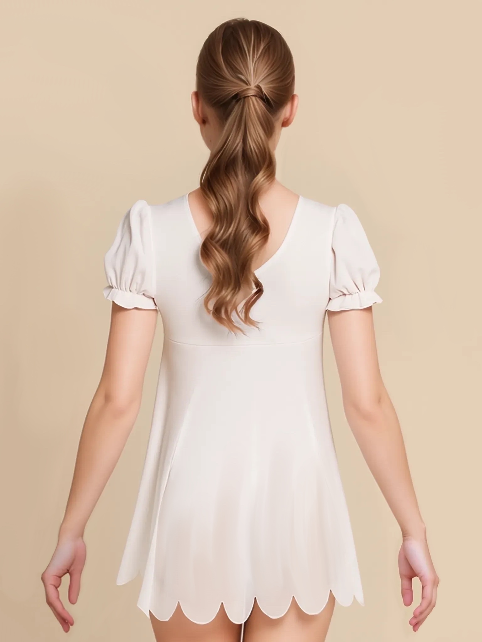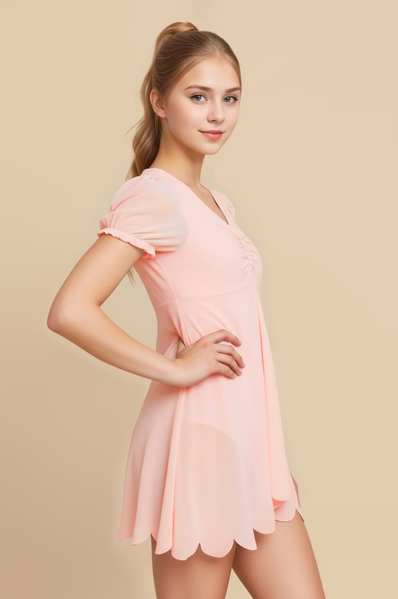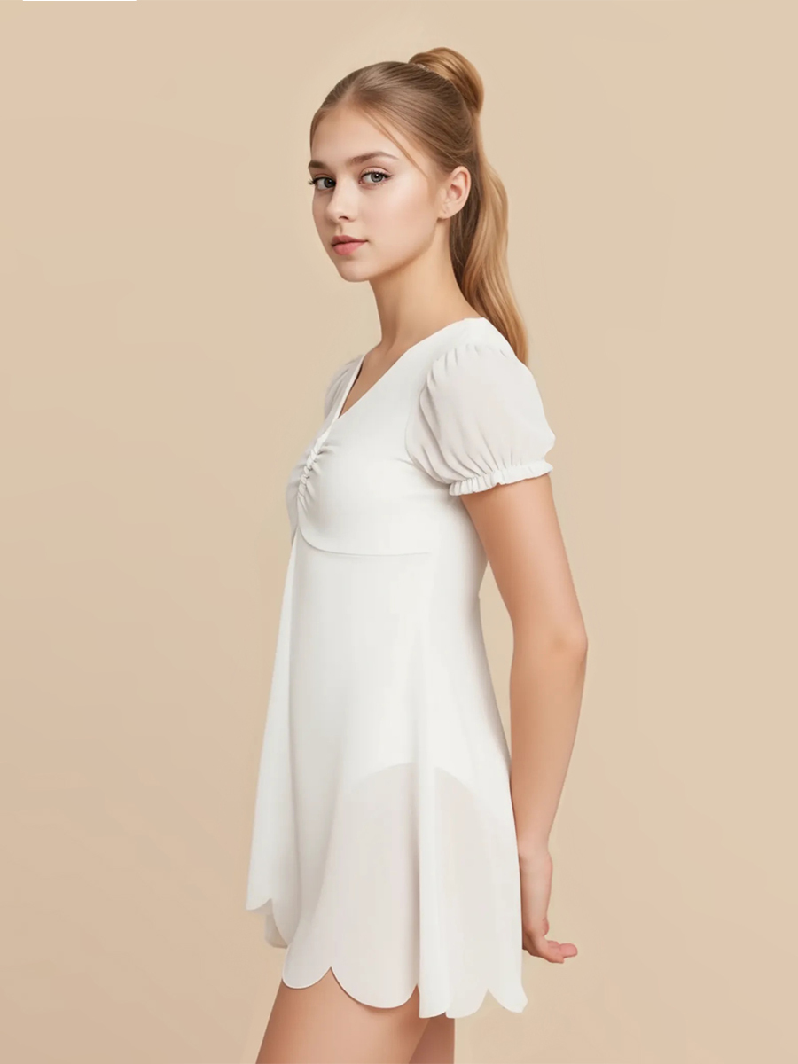 Горловина переда V-образная. Перед с небольшой вертикальной сборкой декорирован рюшей из сетки. Рукав-фонарик из сетки присобран внизу на эластичную резинку. Низ юбки оформлен фестонами.