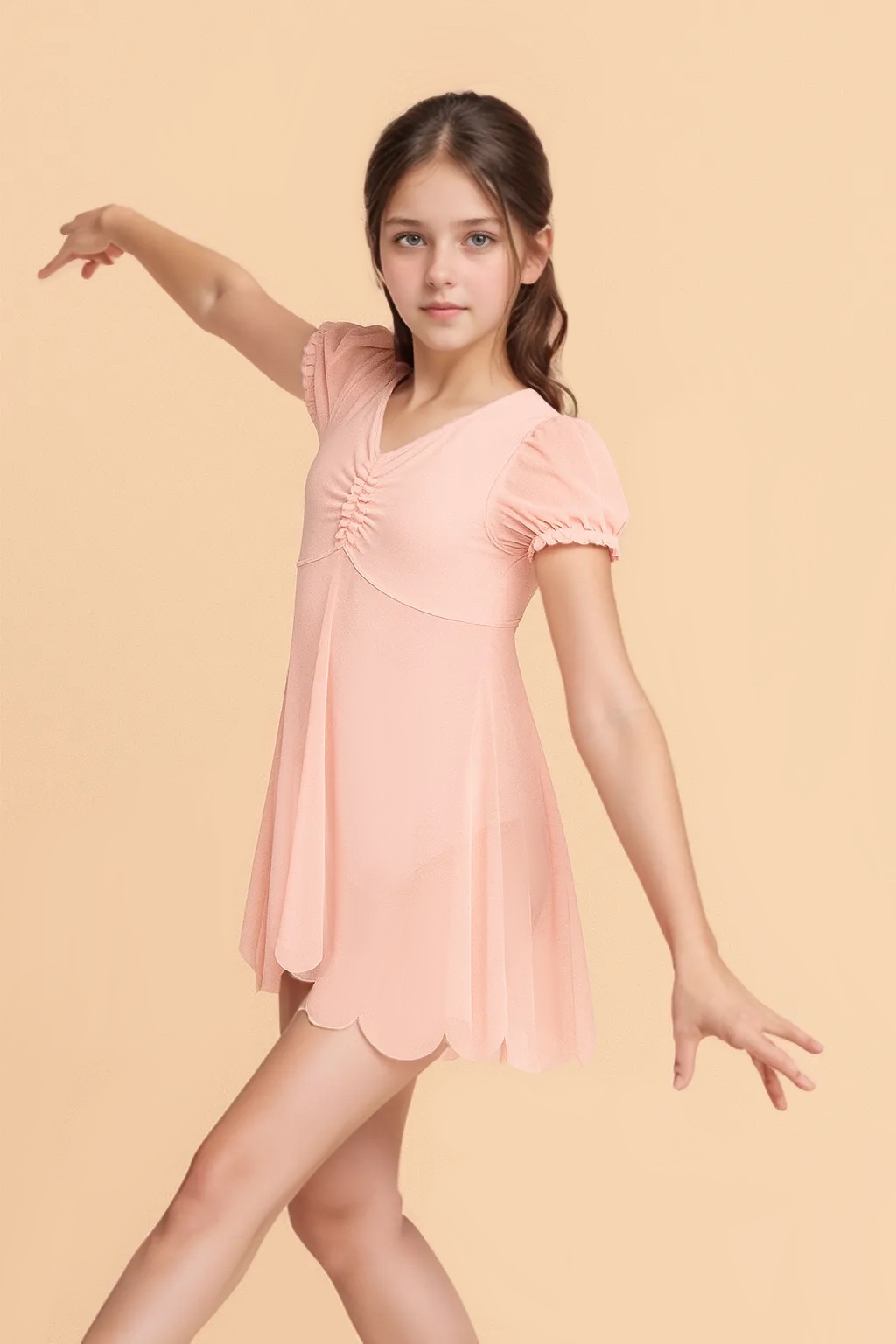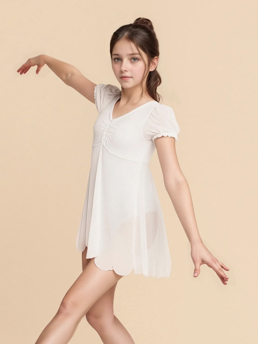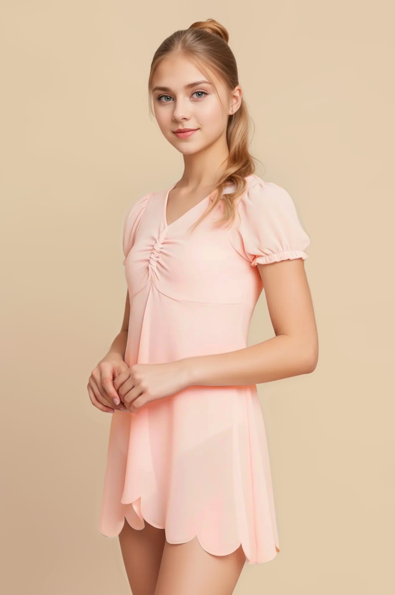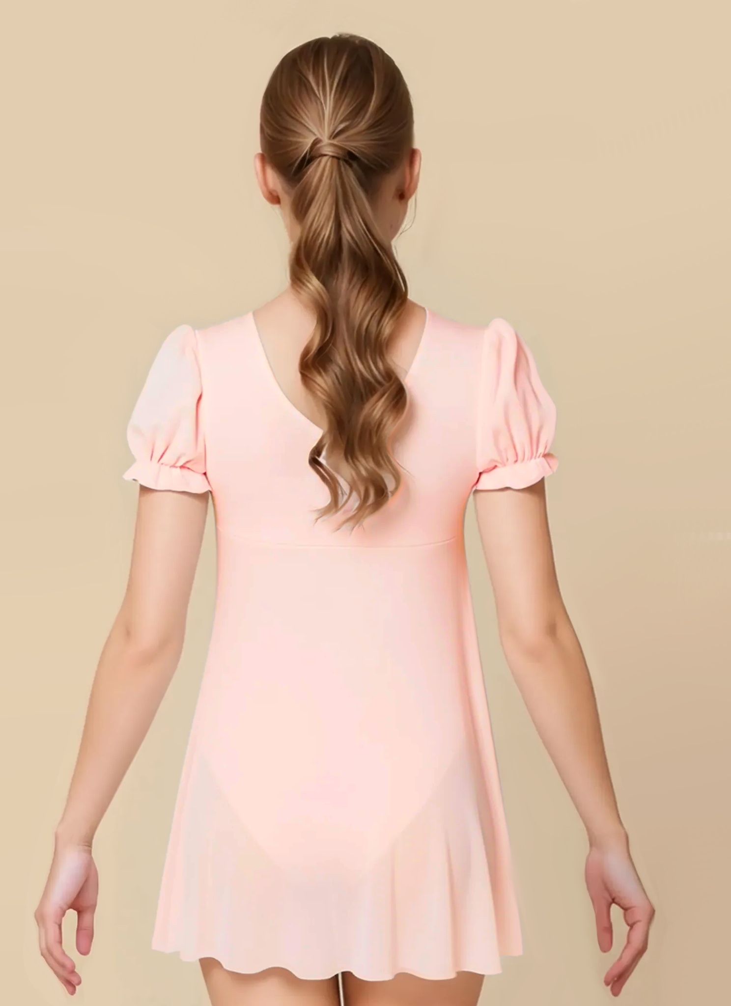 Г 11.3 Костюм гимнастический для девочек с подрезом под грудью, в который втачена юбка из сетки длиной впереди до линии колен, а сзади чуть длиннее.