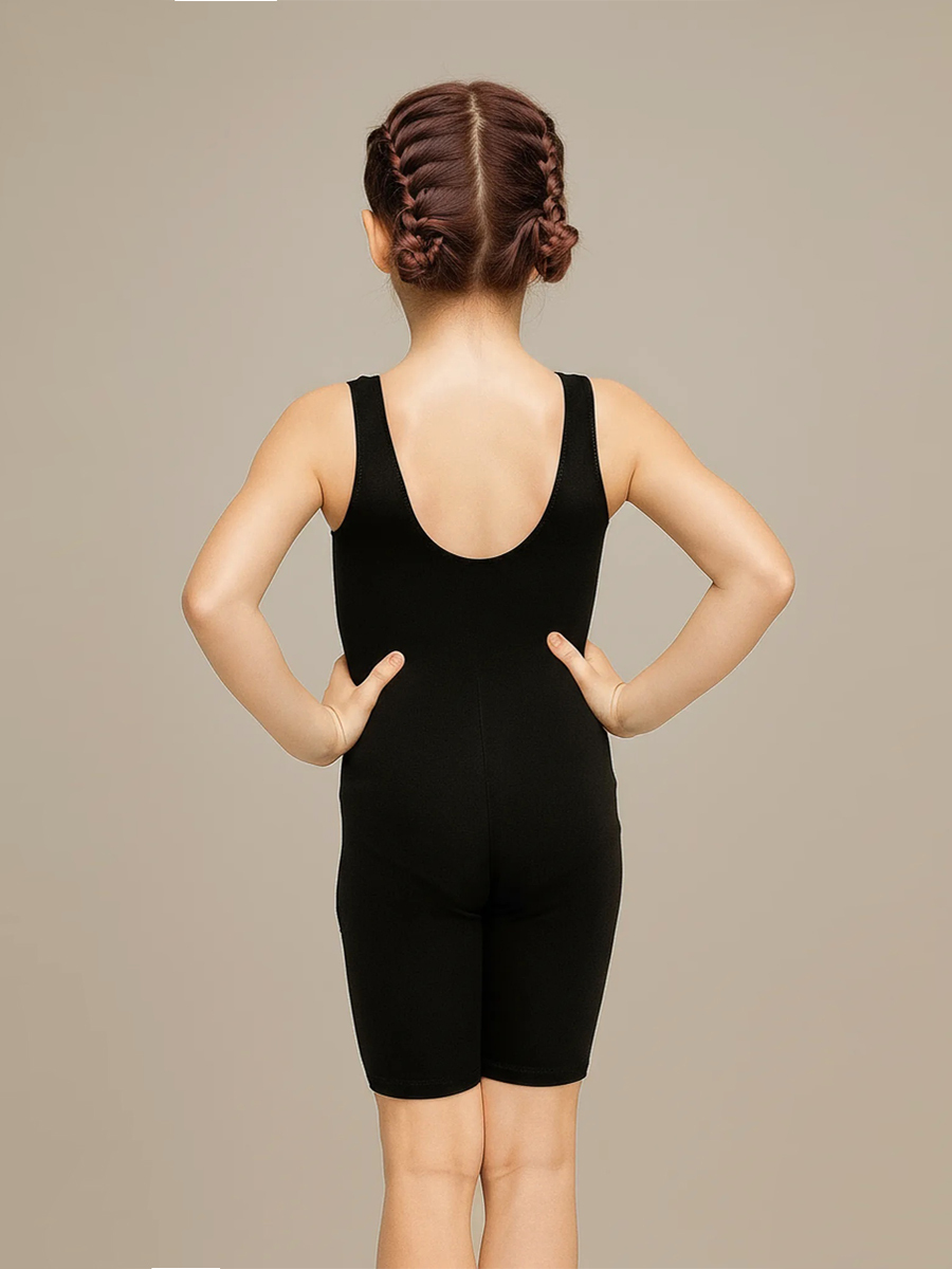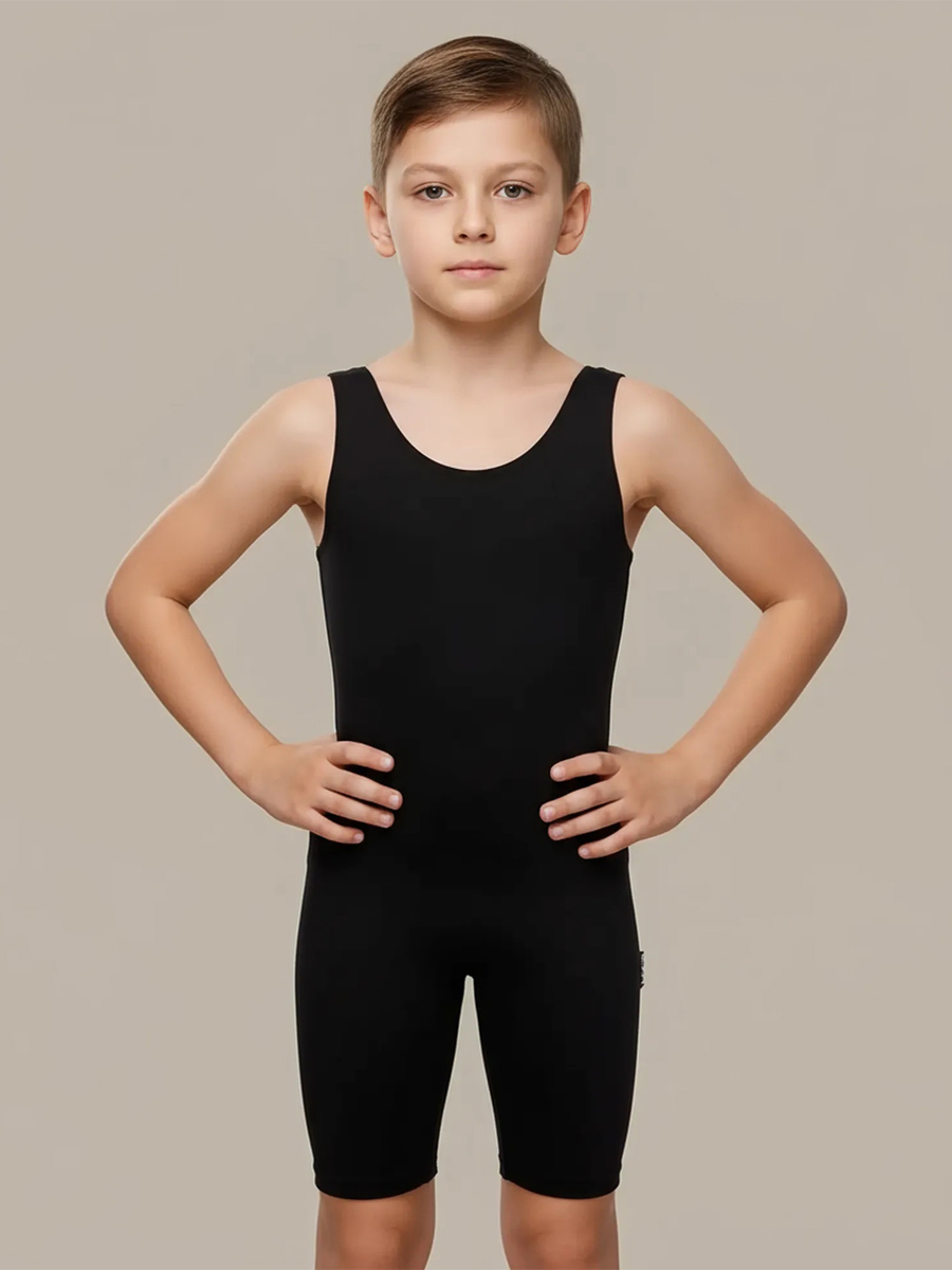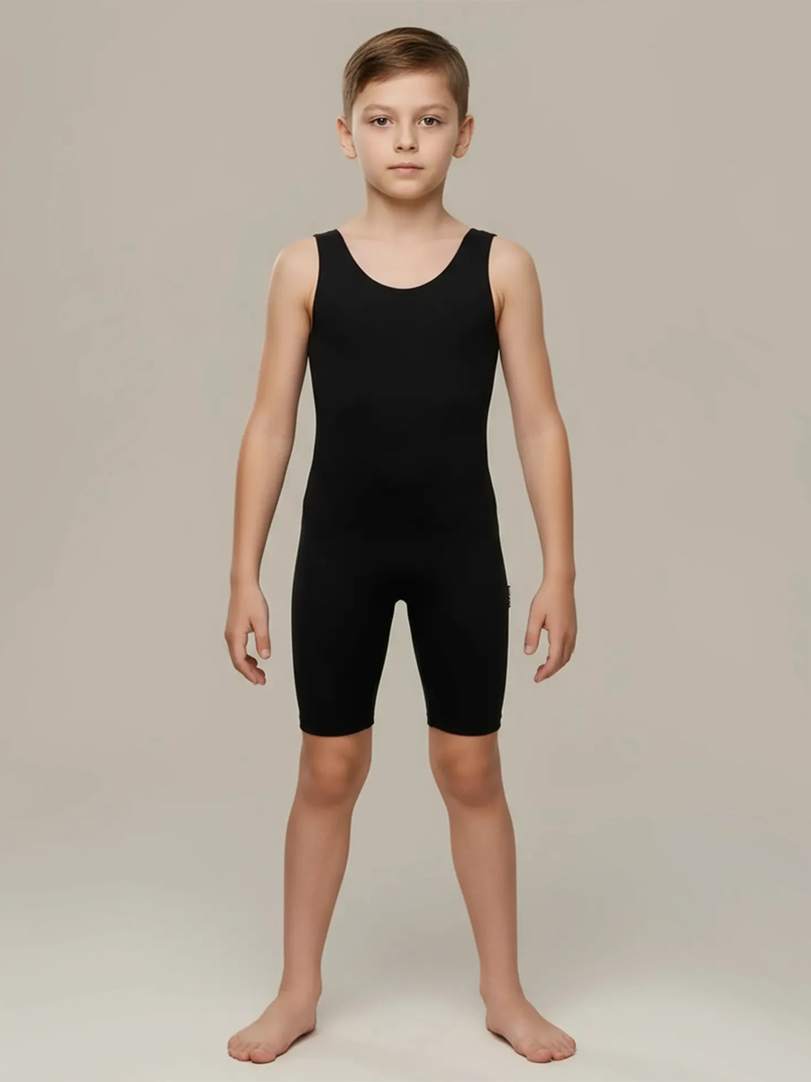 ГК 4.03 Комбинезон детский гимнастический унисекс облегающего кроя имеет нижнюю часть в виде облегающих велосипедок длиной выше линии колен и верхнюю часть в в виде майки на широких бретелях.