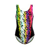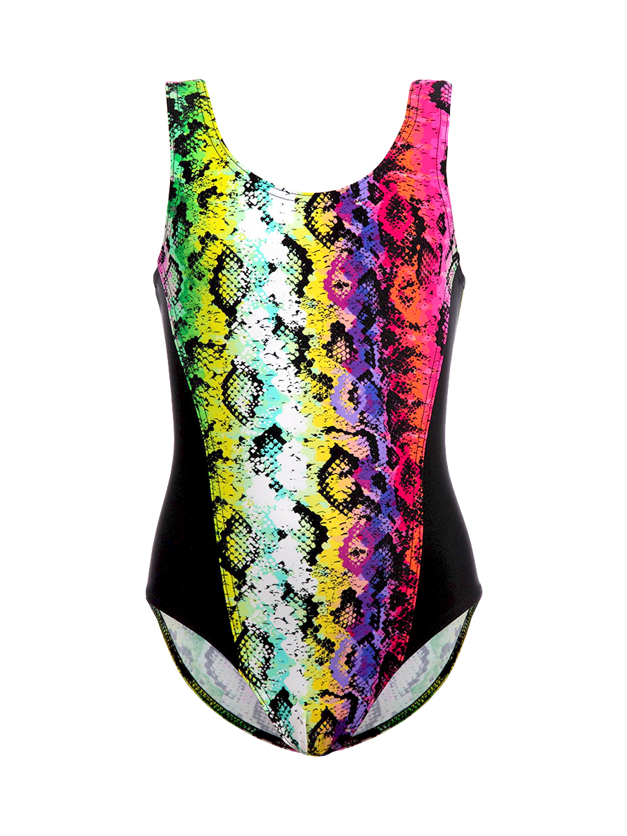 Центральная часть переда и спинка выполнена из ткани с ярким принтом. Перед с однотонными боковыми рельефами,контрасткого цвета, выходящими от линии проймы до линии ножек.