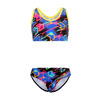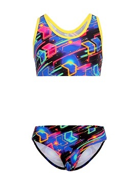 К 23.011 Стильный раздельный купальник в спортивном стиле для девочек выполнен в ярком принте. Лиф - топ по типу "борцовка" с яркой контрастной окантовкой. Плавки комфортной посадки со средней высотой линии бока. Универсальная модель подходит как для пляжа, так и для занятий в бассейне.