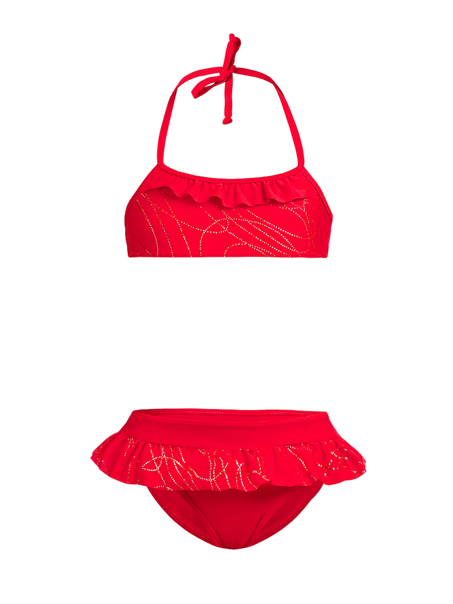 К 23.04 Двухпредметный купальник для девочек выполнен из яркой ткани. Перёд топа и рюша на плавках из ткани с эффектом метализации, что очень красиво бестит на солнце.  Верх- удобный топ с изящной оборкой по линии горловины, фиксируется тонкими эластичными завязками на шее. Спинка цельновыкроенная, что особенно удобно для детей. Плавочки с комфортной посадкой и пышной рюшой.