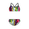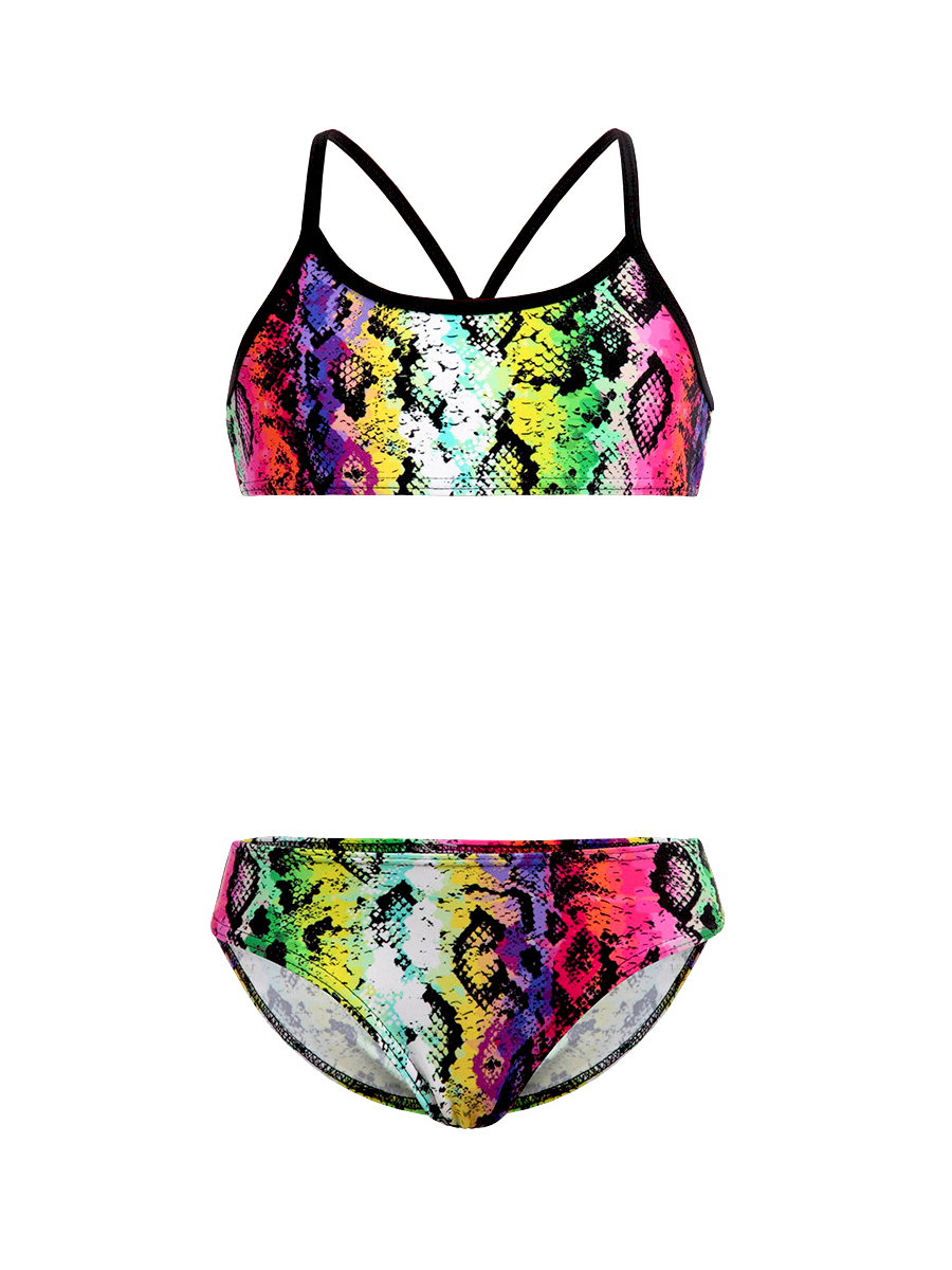 К 23.20 Эффектный раздельный купальник для плаванья в спортивном стиле для девочек, выполнен в ярком принте. Верх- топ анатомического кроя обработан контрастной бейкой, переходящей в тонкие эластичные лямками и сходящимиеся в центре спинки.