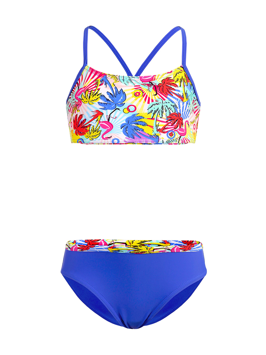 К 23.21.5 Эффектный двухпредметный для плаванья купальник в спортивном стиле для девочек выполнен в сочетании яркой принтованной и однотонной ткани.Верх- топ анатомического кроя с тонкими эластичными лямками,сходящимися в центре спинки.