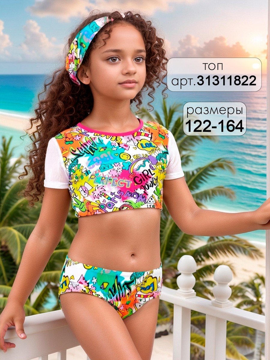 К 23.21 Эффектный раздельный купальник для плаванья в спортивном стиле для девочек, с ярким модным принтом. Верх- топ анатомического кроя обработан контрастной бейкой, переходящей в тонкие эластичные брители и сходящимиеся в центре спинки.