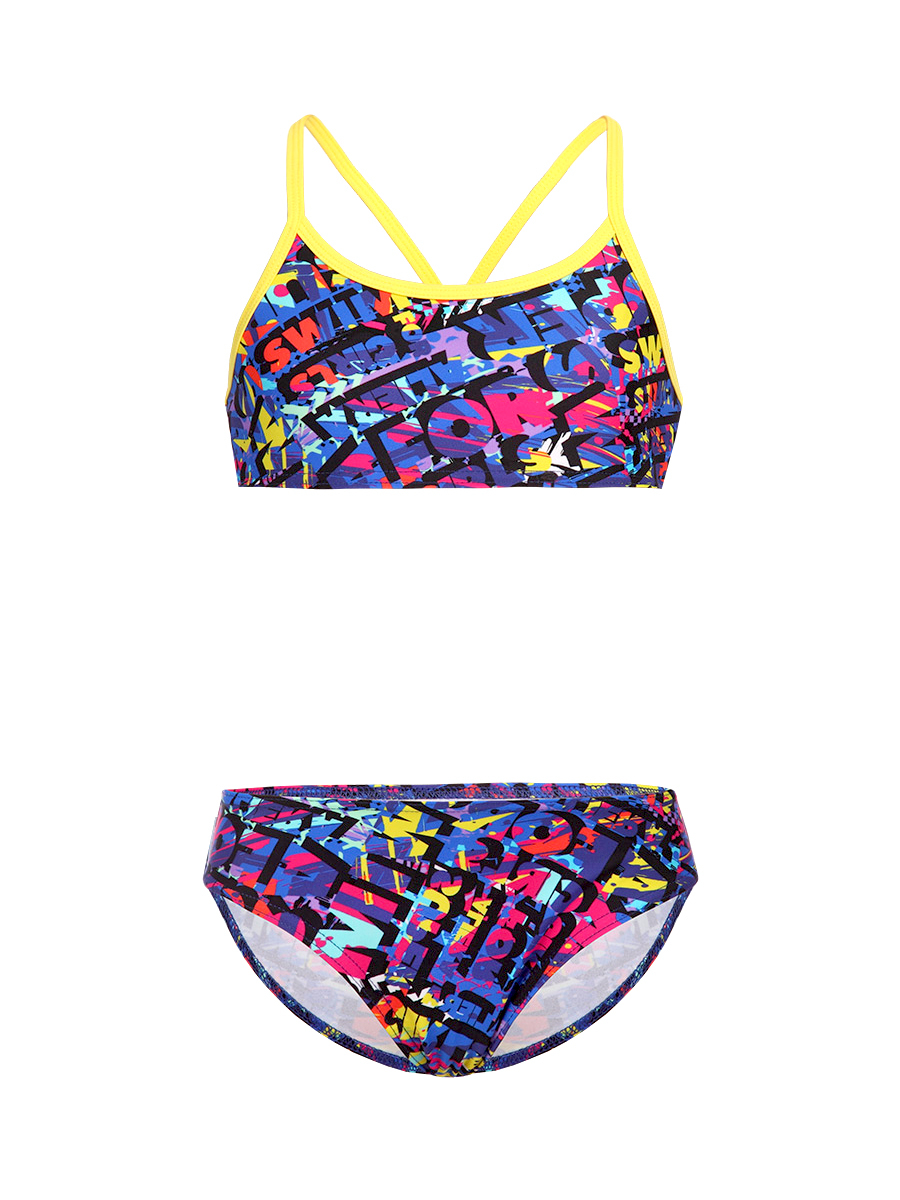 К 23.23 Эффектный раздельный купальник в спортивном стиле для девочек выполнен в ярком принте. Верх- топ анатомического кроя с тонкими лямками,сходящимися в центре спинки.