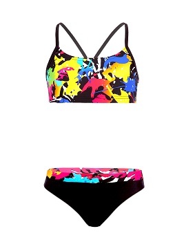 К 23.29 Эффектный раздельный купальник для девочек выполнен в ярком принте. Верх- топ анатомического кроя с тонкими лямками сходящимися в центре спинки.