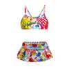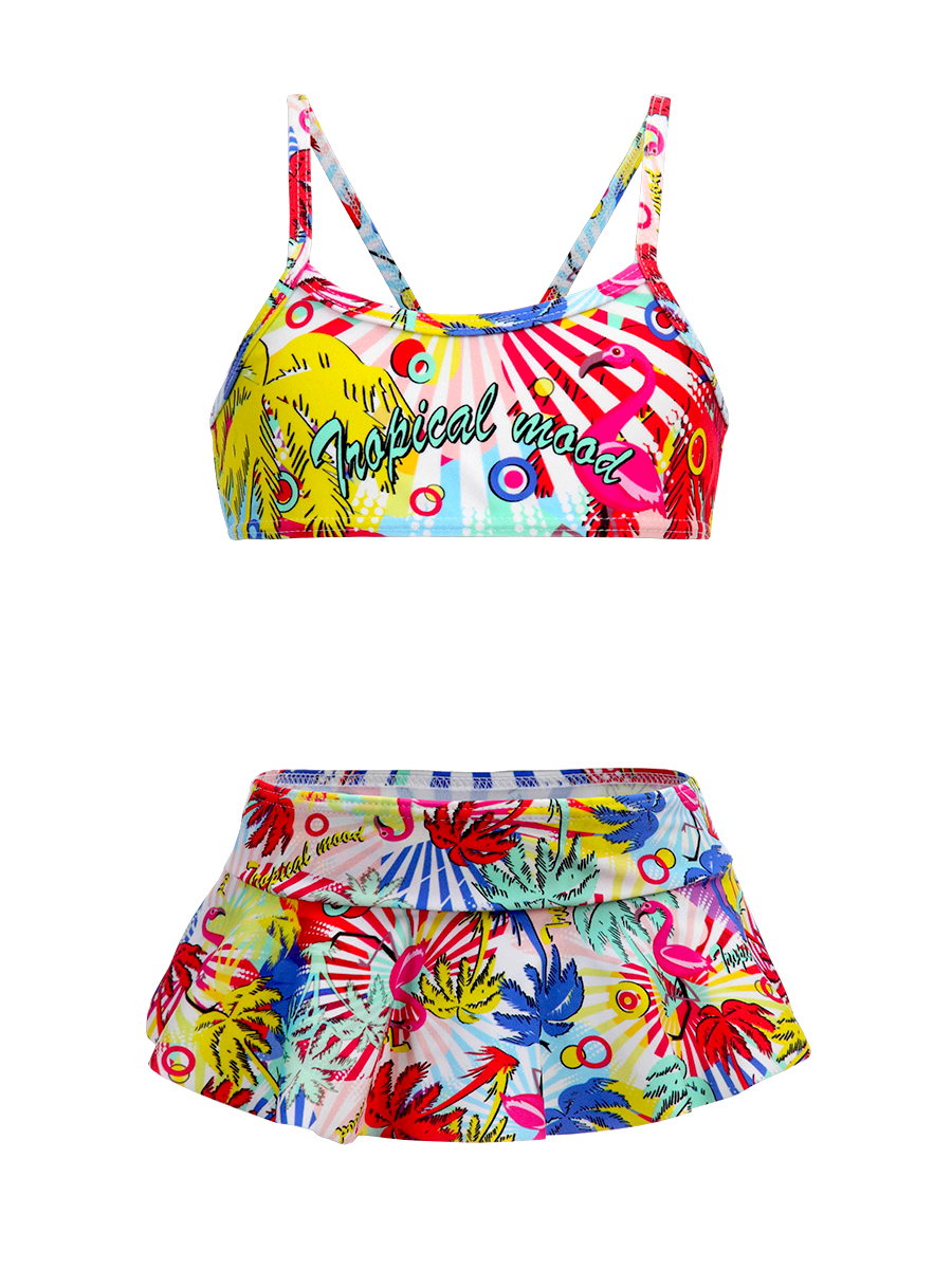 К 23.51 Модный двухпредметный купальникдля плаванья из очень яркой принтованной ткани . Верх лиф - топ с тонкими эластичными брителями, которые закреплены в центре спинки.