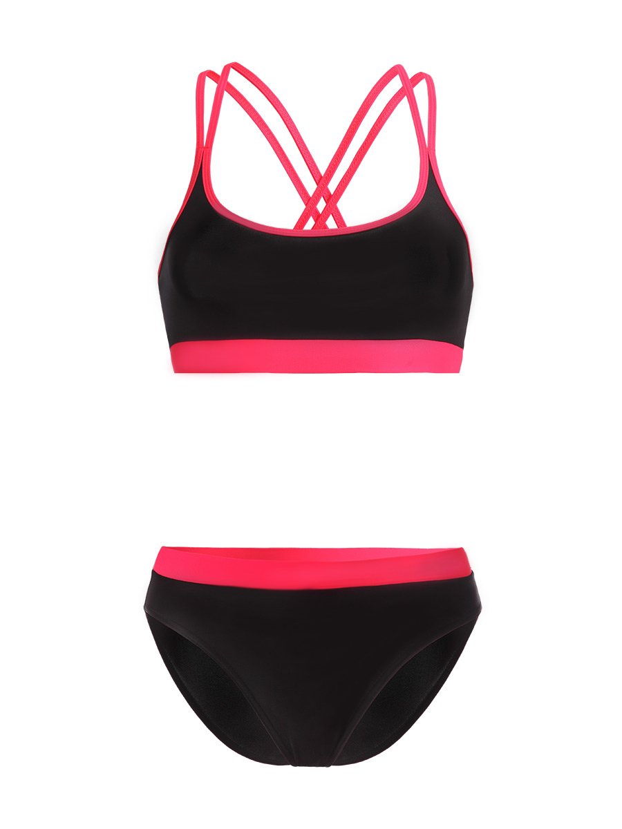 Эффектный раздельный купальник в спортивном стиле для девочек выполнен однотонной ткани.Верх- топ анатомического кроя с двойными контрастными лямками, сходящимися в центре спинки крест - накрест.