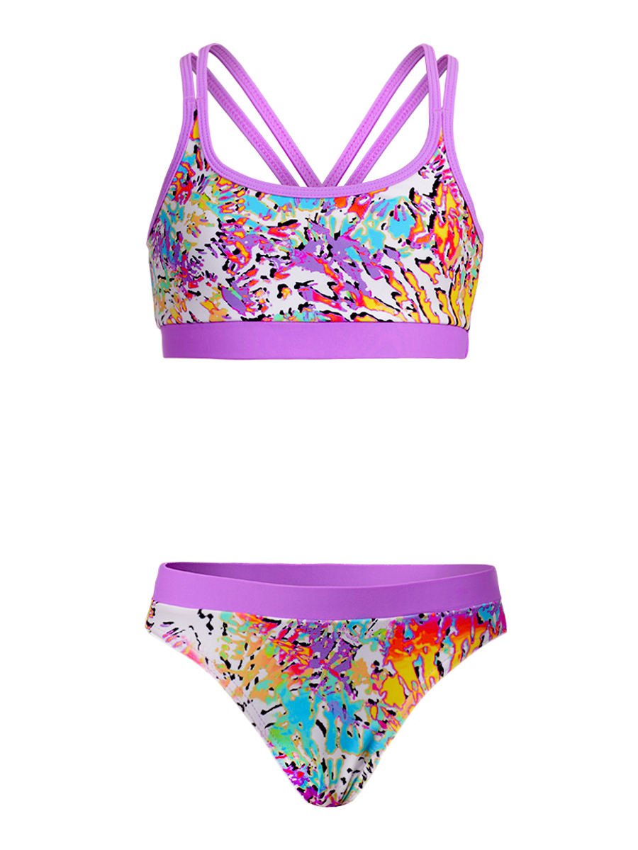 К 24.07 Двухпредметный купальник в спортивном стиле для плаванья выполнен в ярком модном принте. Верх- топ анатомического кроя с двойными тонкими лямками, сходящимися в центре спинки.