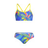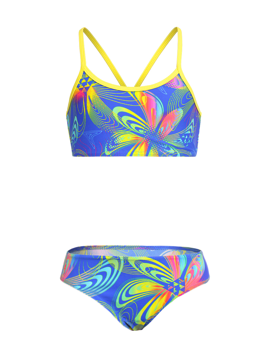 К 24.08 Эффектный раздельный купальник в спортивном стиле для девочек выполнен из яркой принтованной ткани.. Верх- топ анатомического кроя с тонкими эластичными лямками, сходящимися в центре спинки. Плавочки комфортной посадки со средней высотой линии бока.