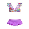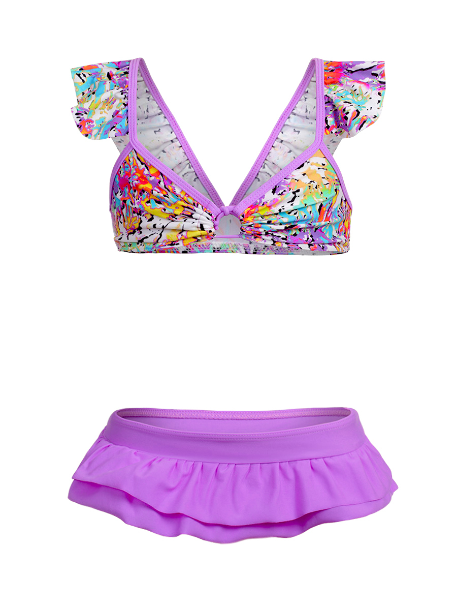 К 24.18 Модный раздельный купальник для девочек выполнен из двух видов ткани. Верх- топ с из ткани с ярким принтом имеет регулируемую драпировку по центру . Эластичные брители декорированы рюшами. Однотонные плавочки комфортной посадки с пышной двухслойной юбочкой на кокетке.