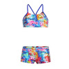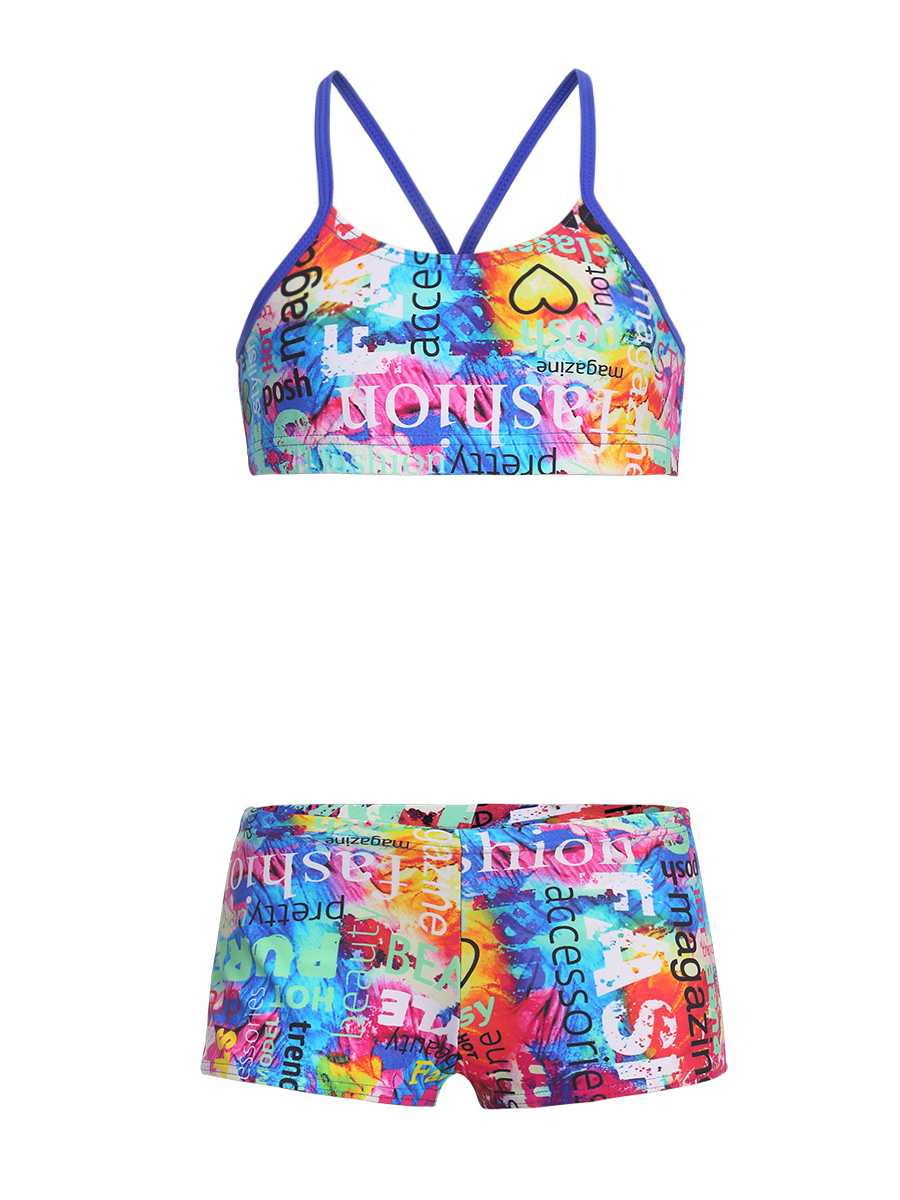 К 24.23 Эффектный раздельный купальник в спортивном стиле для девочек выполнен из яркой принтованной ткани.. Верх- топ анатомического кроя с тонкими эластичными лямками, сходящимися в центре спинки. Трусы-шортики комфортной посадки с мягкой резинкой.