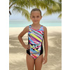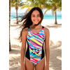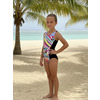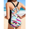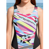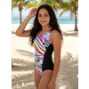 К 24.55 Купальник спортивный комбинированный из двух цветов ткани. Центральная часть переда и часть спинки выполнены из принтованой ткани, боковые вставки из контрастной однотонной ткани. Спинка с фигурным вырезом и широкими брителями, закреплёнными крест - накрест.