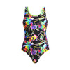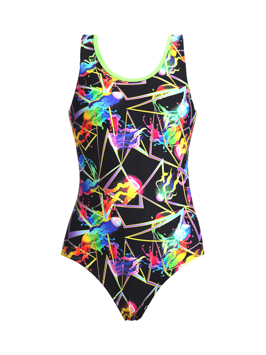 К 25.46 Яркий слитный купальник для девочек выполнен в абстрактном фантазийном принте .Купальник с широкими удобными бретелями. Линия горловины с яркой неоновой окантовкой, переходящей на спинке в красивое и удобное в носке перекрестье.