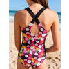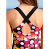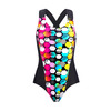 Боковые швы смещены на спинку. Спинка с фигурным вырезом и с яркими широкими брителями, закреплёнными крест - накрест, что обеспечивает дополнительный комфорт в использовании. Ткань купальника специально разработана для данного ассортимента: устойчива к воздействию ультрафиолета, хлору, быстро сохнет.