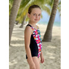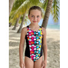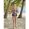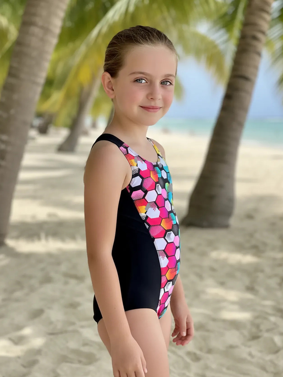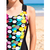 К 25,55 Купальник слитный спортивный для девочек комбинированный из двух полотен: однотонного и с ярким геометрическим принтом. Центральная часть переда и спинки выполнены с принтом. Перед с вертикальными рельефами, выходящими от линии проймы до линии ножек.