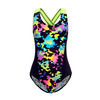 К 25.60 Купальник спортивный комбинированный из двух цветов ткани. Центральная часть переда и часть спинки выполнены из принтованой ткани, боковые вставки из контрастной однотонной ткани. Спинка с фигурным вырезом и с яркими широкими брителями, закреплёнными крест - накрест.