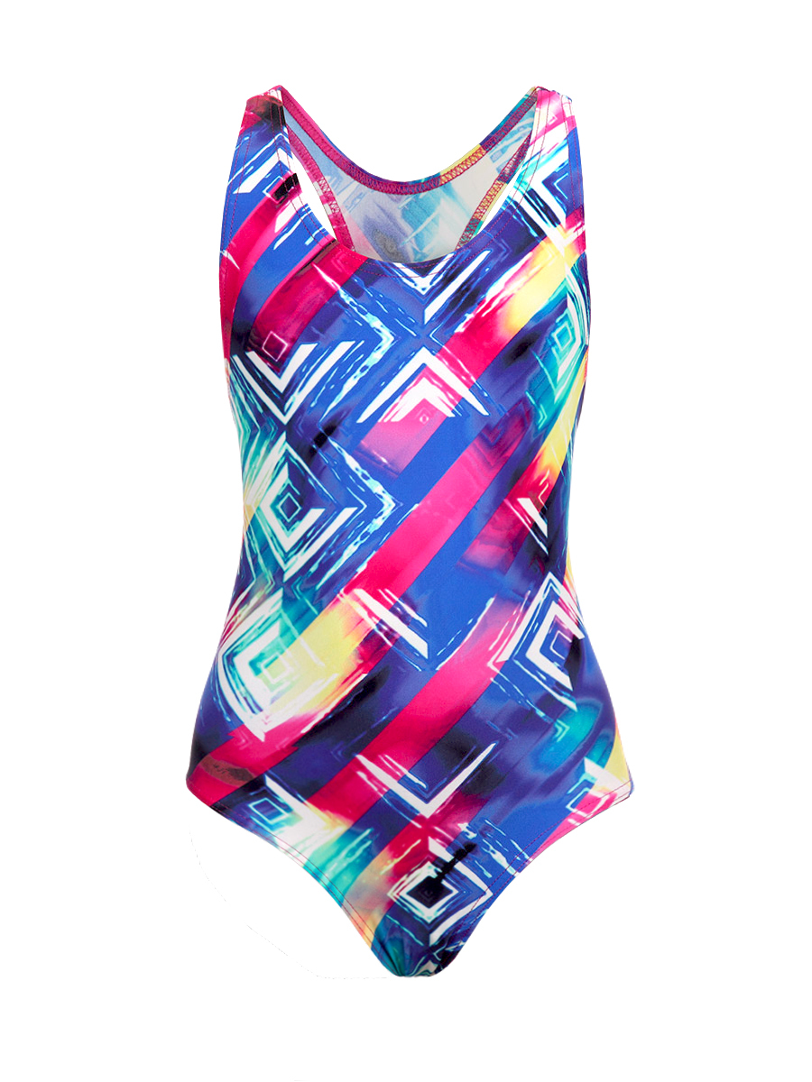 К 25.69 Спортивный слитный купальник для девочек с удобными широкими бретелями, со спинкой анатомического кроя по типу "борцовка" выполнен в абстрактном принте. Модель идеально подходит для тренировок в бассейне.