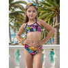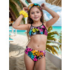 К 25,76 Классический раздельный купальник в спортивном стиле для девочек выполнен в ярком неоновом принте. Топ с мягкой эластичной окантовкой по линиям горловины и пройм, переходящей в удобные тонкие эластичные бретели, сходящиеся на спинке в центре. Плавки с комфортной посадкой, со средней высотой линии бока.