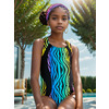 К 25.80 Купальник цельнокроеный для девочек выполнен из однотонной и принтованной лайкры. Спинка с фигурным вырезом. Передняя часть купальника декорирована симметричными фигурными вставками контрастного цвета.