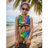 К 25.82 Эффектный раздельный купальник для девочек выполнен с модным принтом "Animal"радуга.Топ с широкими бретелями, фигурным вырезом внизу передней детали, с декоративными тонкими эластичными завязками. Плавки высокой посадки с однотонной задней деталью , с вырезами для ног средней высоты делают модель комфортной для активного пляжного отдыха. Перёд топа и плавок на подкладке из эластичной быстросохнущей сетки.
