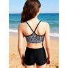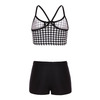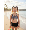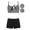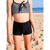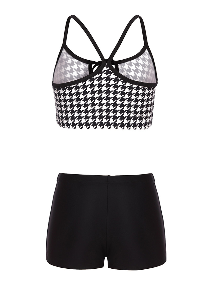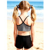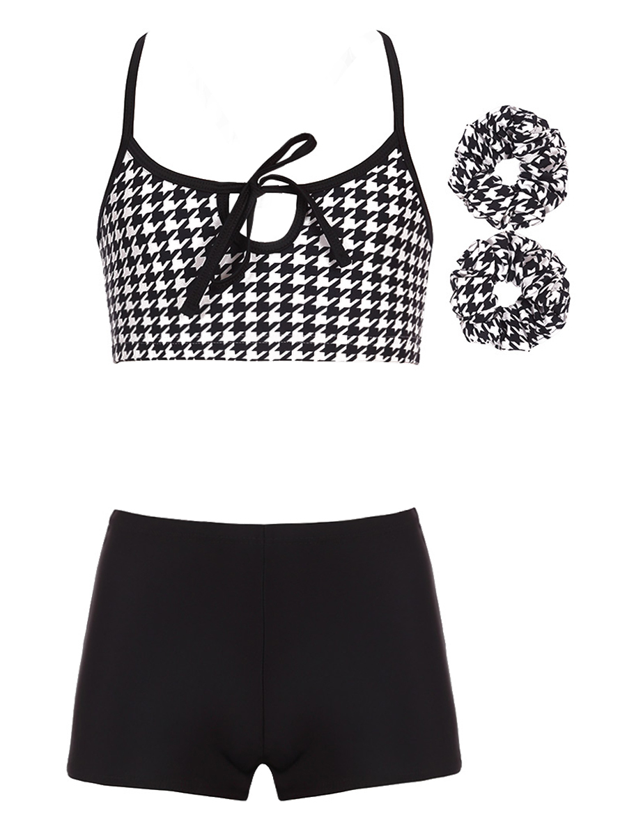 Стильный раздельный купальник для девочки с шортами выполнен в модном принте "гусиная лапка" pied-de-poule незаменим для активного отдыха на пляже или для занятий в бассейне. Купальник состоит из удлинённого топа и чёрных практичных плавок-шорт с высокой посадкой. Топ без застёжек, с изящными эластичными бретелями, со спинкой типа "борцовка", с капелькой впереди, завязывающейся на кокетливый бантик. Глубокие шорты с эластичной резинкой по верху обработаны плоскими строчками для комфорта и идеального прилегания. Материалы, используемые для этого комплекта, специально разработаны для данного ассортимента: быстро высыхают, устойчивы к хлору и ультрафиолету. Модель оценят и девочки младшего возраста и девушки-подростки. Перёд топа и перёд плавок на подкладке из мягкой эластичной сетки. В комплект к купальнику входят две резинки для разнообразных причёсок ваших модниц. Купальник произведён в РФ, безопасен и сертифицирован.