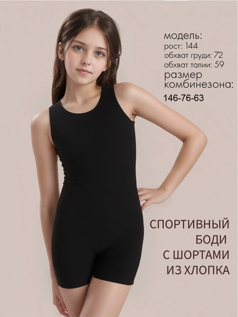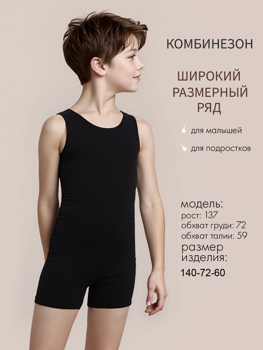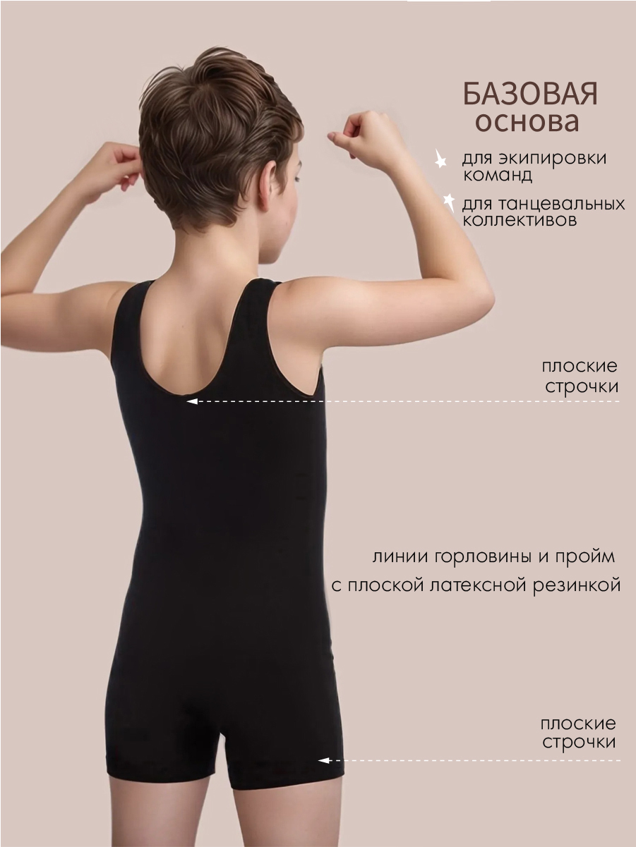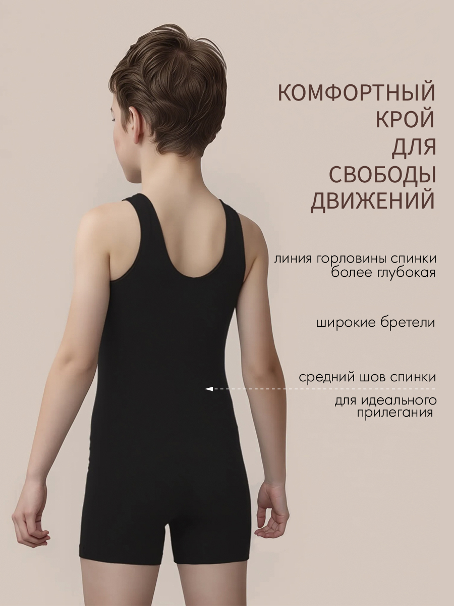 ГК 1.03 Комбинезон детский гимнастический унисекс облегающего кроя имеет нижнюю часть в виде шорт и верхнюю часть в в виде майки на широких бретелях, выполнен из эластичного хлопкого полотна, произведенного в Европе.