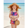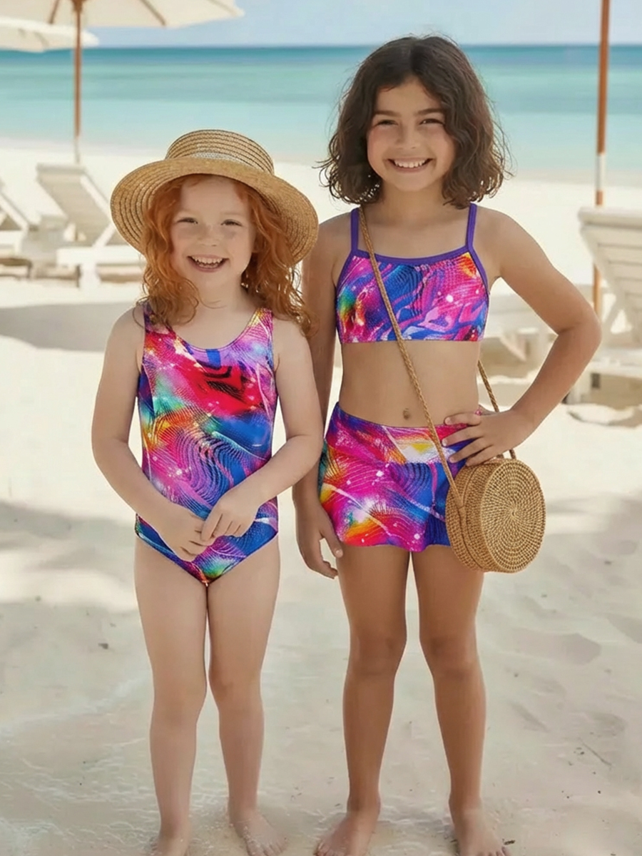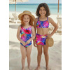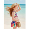 К 23.57 Модный двухпредметный купальникдля плаванья из очень яркой принтованной ткани . Верх лиф - топ с тонкими эластичными брителями, которые закреплены в центре спинки.
