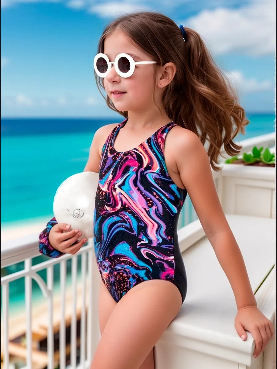 К 25,48 Слитный купальник для девочек в спортивном стиле выполнен с ярким абстрактным авторским принтом. Широкие бретели, спинка типа "борцовка", вырезы для ног средней высоты делают модель комфортной для активного пляжного отдыха, посещения бассейна, аквапарка.